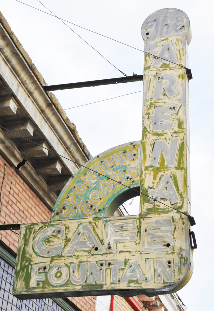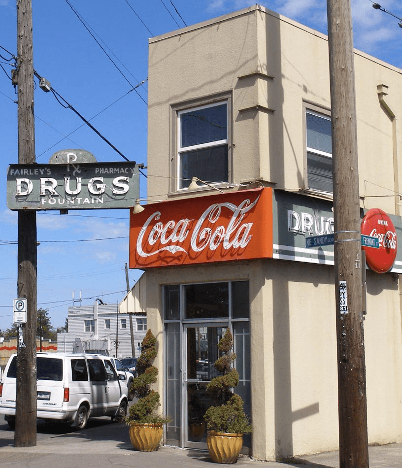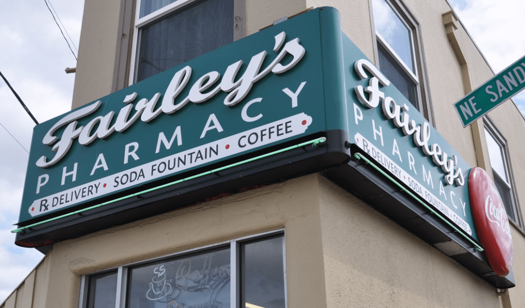 Fairley’s Pharmacy in Portland, OR remains open but the signs have gone through unfortunate changes over the years. Here’s a photo I took in 2008 which shows the neon, a great Coca-Cola sign, an applied letter projecting sign: