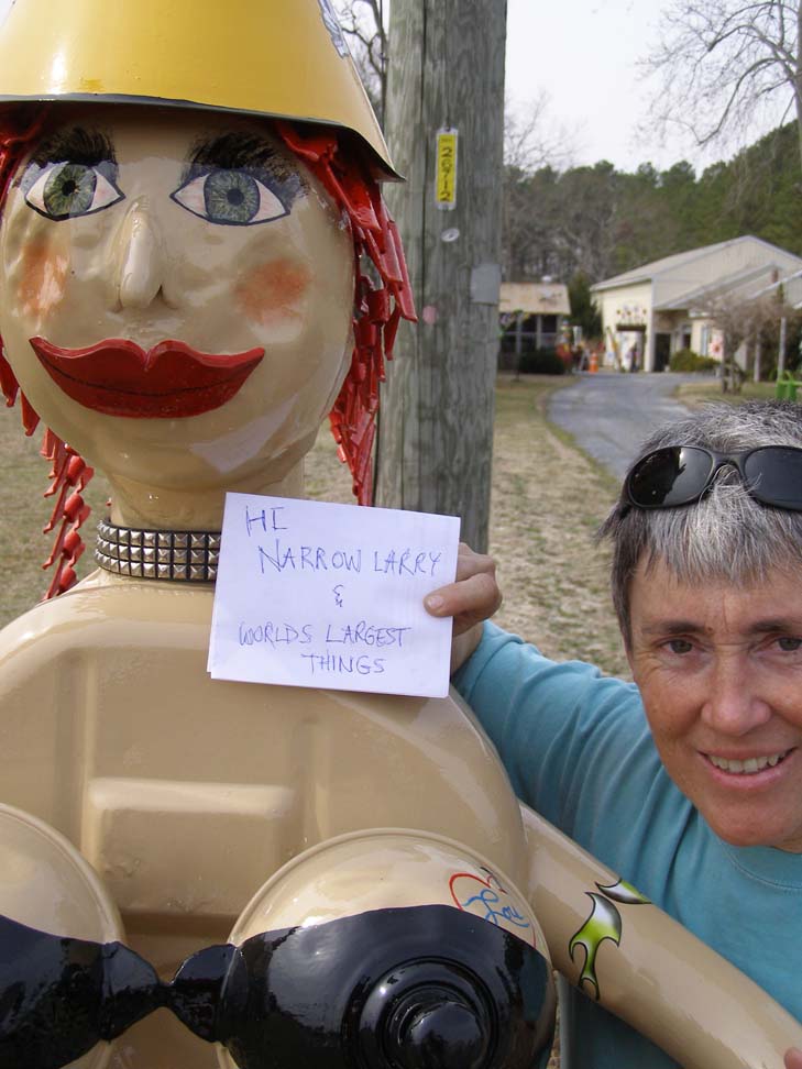 NarrowLarry and World’sLargestThings uploaded a photo for me yesterday. So I thought I’d send them an appropriate thanks-for-thinking-of-me. I got a stranger to take a photo of me with the biker chick. Photography was obviously not his strength as he had trouble getting both of us in the frame.