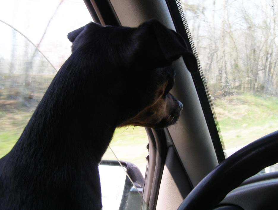 The dogs got to explore and run in church fields and a fairgrounds today. I think I have some Georgia dog parks on my list coming up soon. I’m pleased to see that Grem has developed the same endearing habit as Grip. They both wait in my lap for a big oncoming truck to pass on two-lane roads and then thrash their bodies against the window and snap at the truck just as it passes. It’s always one big bite. Here’s a photo of Grem waiting for the next victim (yes, taken while driving, of course!).