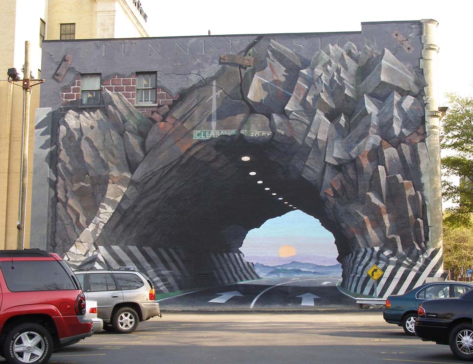 I got a number of great things today from Columbia, SC for the website. Also some fun stuff that wouldn’t fit in there including these trompe l’oeil murals downtown. This one entitled “Tunnelvision” was created by Blue Sky in 1975.