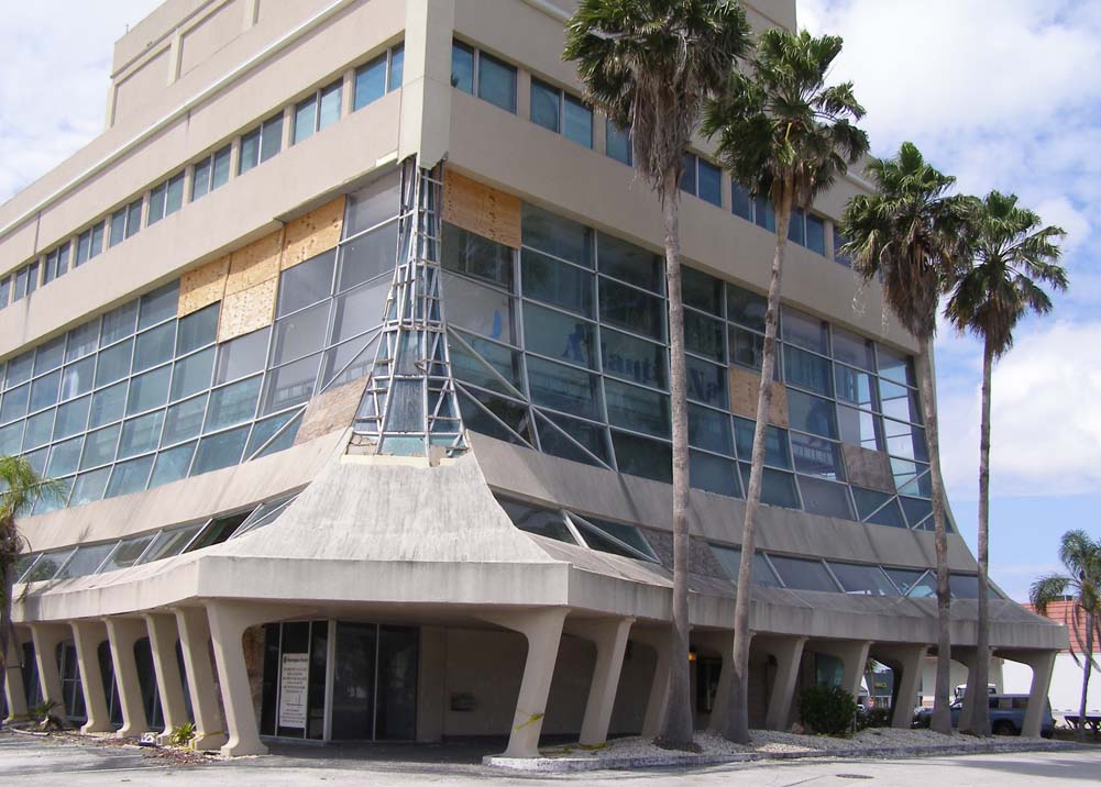 This mid-century building in Cocoa Beach was originally a bank — which one, I don’t know. To get to the drive-through teller, you drive between the legs. You can make out the teller’s window on the right in this photo. I’m not sure if today’s mammoth SUVs would fit in there. I also don’t know what’s happening to this quirky building. It appears abandoned.