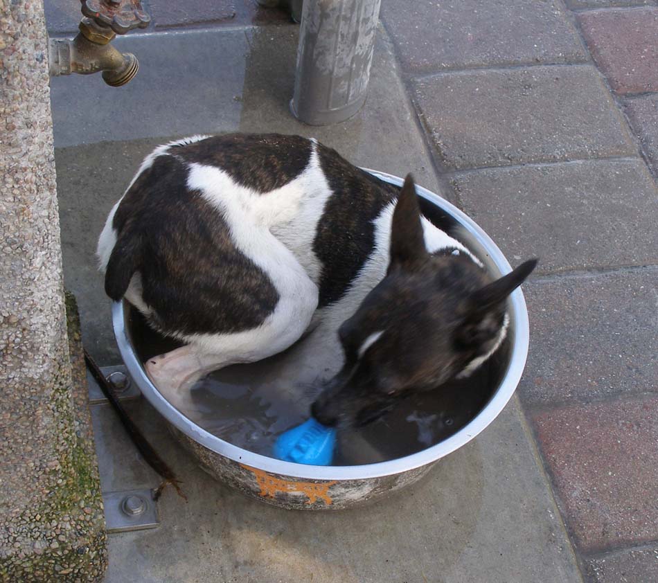 And here he is chilling in the communal drinking bowl with his blue dinosaur (he’s favorite toy at the moment). He knows most of these dog parks have a hose and water set-up. So when he really starts panting after running for maybe 20 minutes, he goes to look for relief. If they don’t have a kiddie pool, he makes his own.