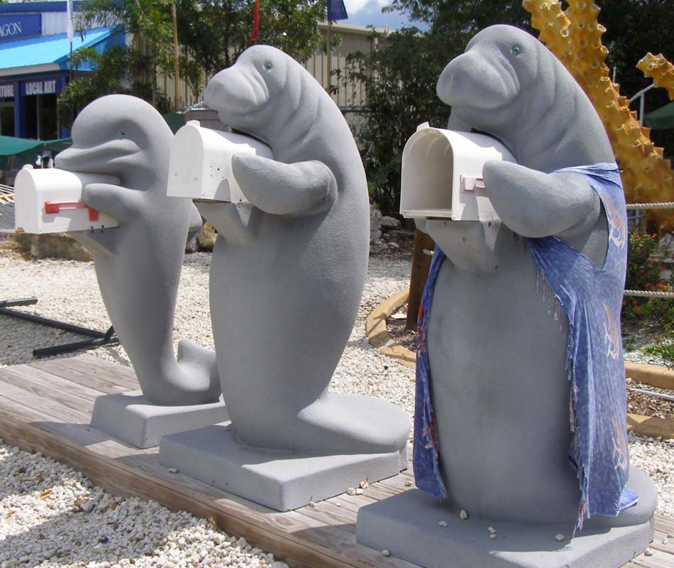 The Overseas Highway is loaded with restaurants and gift shops. These figures are pretty tacky but still cute. I’ve seen a number of these manatee mailboxes in use on this trip.