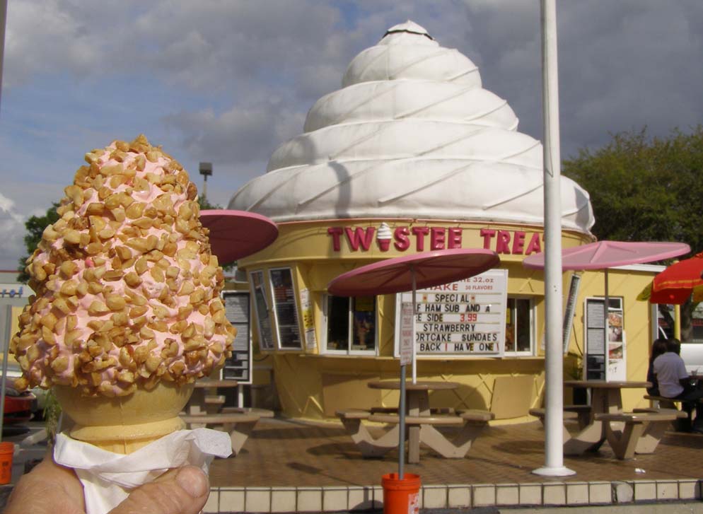 My food has not been all that exciting lately. Salads from supermarkets, White Cheddar Cheez-its to munch on, souffles from Panera, cookies from Starbucks… I haven’t really found any regional fun food to share with you. But since I’ve never actually had a cone from Twistee Treat, I thought I’d better take the plunge today in case I don’t see any tomorrow. I’ve taken photos of about 10 locations so far on this trip. I tried the strawberry to match the umbrellas. It was as wonderful as it looks. Yes, I always get nuts with my ice cream. I can’t think of any food that isn’t enriched by nuts. This was the small!