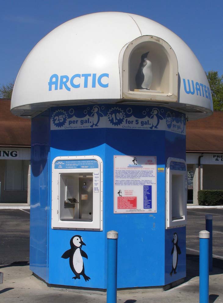 I’ve seen a few of these cute water vending machines scattered around Florida. I love the penguin statue in the igloo top.