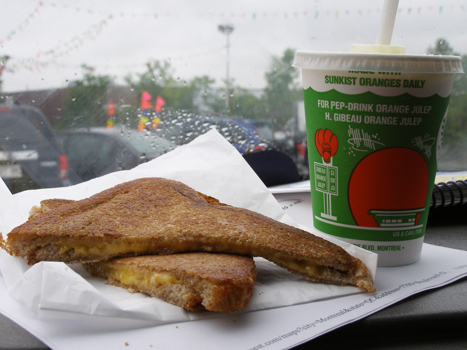 One of the high points of the day was finally getting to see the Orange Julep stands in Montreal. One is shaped like a giant orange while the other has incredible neon (both shown at the regular Flickr stream tonight). Lunch was from the giant orange — grilled cheese (as tasty as it looks – not) and a small julep (frothed up orange juice).