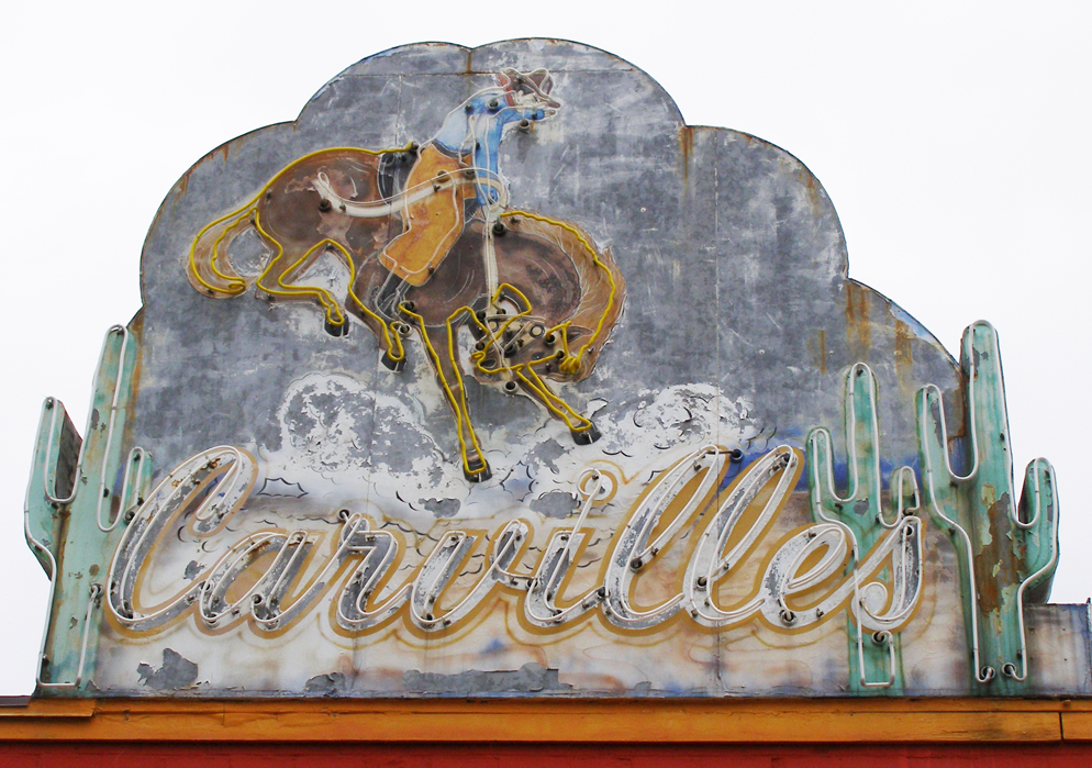 I’m not sure what to make of this sign. Carville’s Ranch House in Hartford, CT may or may not be an old place. The “Ranch House” channel neon lettering looked new to me — or maybe just altered/replaced. This neon piece looks pretty old to me. Regardless, a cowboy & cactus sign, old or new, is always worth hitting the brakes.