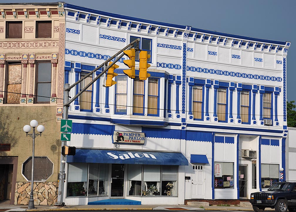 I was looking for a gas station in New Vernon, IN towards the very end of the day. I had even brought a printed photo and showed it to a bunch of local folks. But still nobody seemed to recognize it. New Vernon did have other interesting buildings anyway, including this twin. Nice detail but the color really makes it. Like giant china plates.