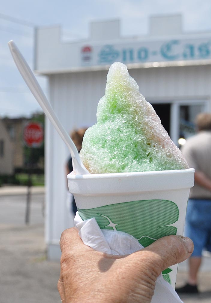 By afternoon, it was in the mid-90s. I made a pit stop at the Sno-Castle in Latonia, KY to celebrate the completion of the Ohio portion of our trip. Well, actually, there might be a tiny bit more Ohio to come on the way home. I hope to spend a day at the American Sign Museum in Cincinnati combing the files for sign stuff — a gracious invitation from Tod. For those of you that don’t know, I write the signs column for the SCA (Society for Commercial Archaeology) so I’m always eager for new info and ideas. Anyhow, I got a snow cone with two of my favorite flavors: peach and lime. The dogs weren’t sure what to make of it — preferring ice cream to ice. Grip & Fixie wanted none of it. Nik sort of licked it. But Grem crunched it down happily.