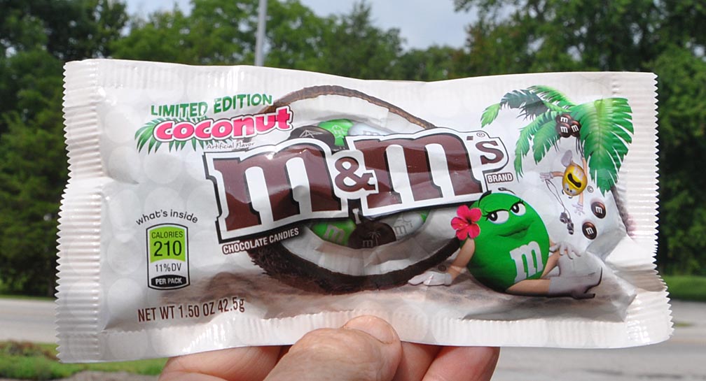 Today’s road snack. Nothing all that coconut-y about these M&Ms. Just a few little strands next to the chocolate inside. I’d stick to Mounds if it’s coconut you crave: