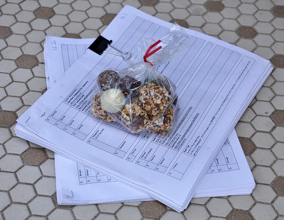 Here’s what the “clumps” (lists and maps) for Illinois look like — topped with a little truffle assortment from McCord Candies in Lafayette. I’m sure the truffles will be gone before I finish this batch of destinations. I expect I’ll be in Illinois for at least four days.
