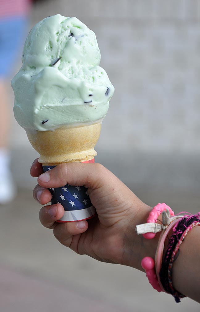 Okay — this is NOT my cone. Having just had a snack, I could only regret it and lust after someone else’s good fortune. This young girl was happy to have me shoot her cone. I love her bracelets. Maybe this will be a neck tack for me: to shoot other people’s food. This portrait taken at the Original Frozen Custard in Lafayette (a photo of the building over at my Flickr agilitynut account tonight).