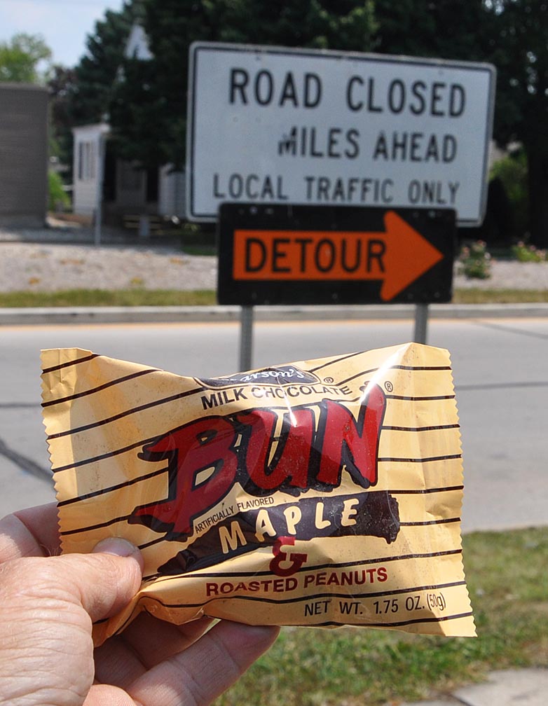 Today’s junk food discovery. I give it an A-. A Rocky Road sort of thing with marshmallow, caramel and nuts. Posed in front of a detour sign — which was a recurring phenomenon for the day. Lots of road work and in addition to that, annoyingly speed limit-obedient drivers. Had hoped to at least get SOME Illinois stuff in today but no such luck.