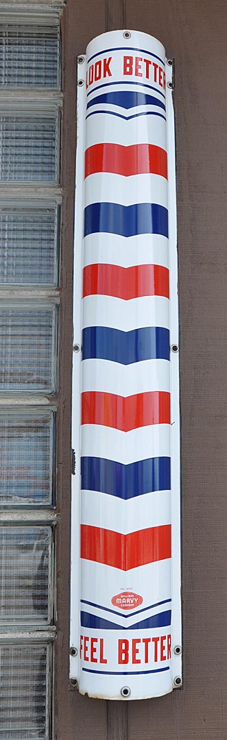 I can’t remember where I shot this. But I have seen a number of these barber shop signs in different states now. This one is in pretty good shape — and yes, still used in conjunction with a barber shop.