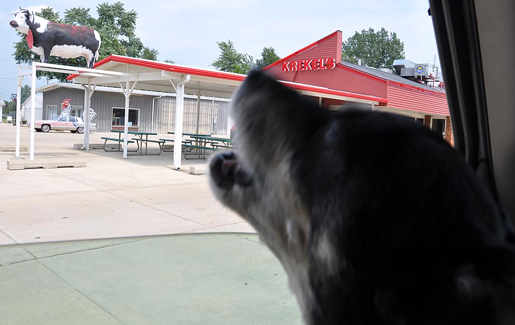 Not much slips by Grippie. Here she makes it clear that cows should NOT be on roofs. She had less to say about chicken cars (see background).