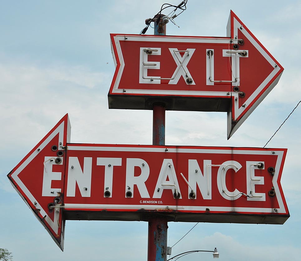 At the Pines Shopping Center in Decatur. It seems a bit strange (and dangerous) to have both Exit and Entrance on the same pole, using the same driveway.