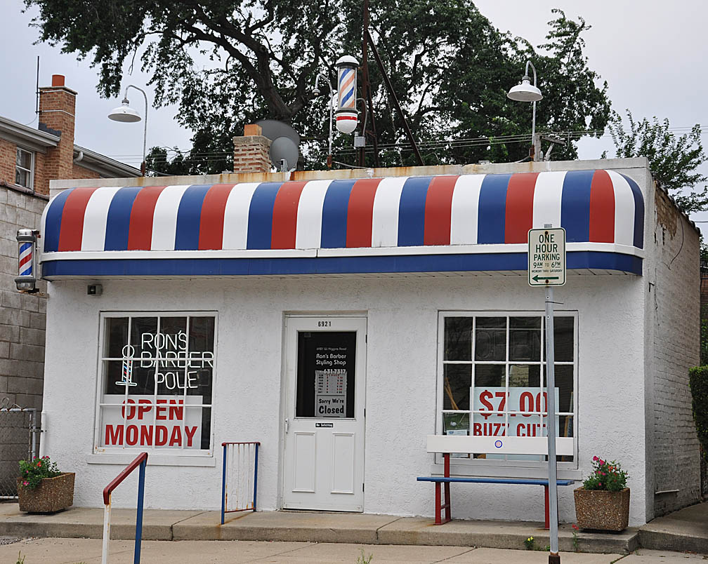 Here’s one to add to the previous barber shop sign photos & discussion on this trip. I can’t say if these two barber shop signs in Chicago were operational — too early in the day for them to be open. Note another of those classic rooftop steel sign things supporting the rooftop sign. Maybe they did use these things for all kinds of signs. But they sure seem funny now when they have cheap, lightweight plastic signs hanging from them.
