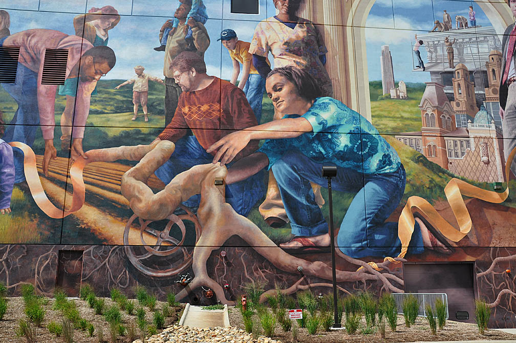 A giant trompe l’oeil mural — sorry, didn’t catch the name if there was one which might help explain what the heck is going on here. Lower left is a door which gives you a sense of scale.