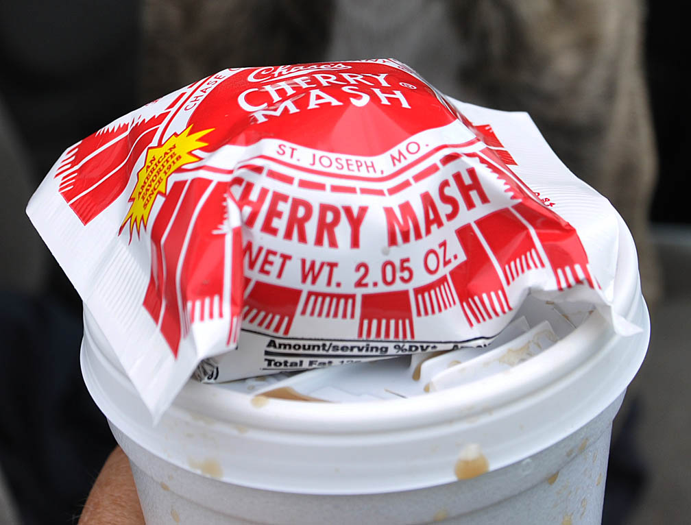 Anyhow, “Cherry Mash” turns out to be a chocholate-covered cherry marshmallow-like stuff. The sweetest thing I think I have every tasted. It was definitely a waker-upper and I ate it strictly for that medicinal purpose. Note to self and audience: do not set chocolate candy on coffee cup for display purposes even for a few seconds. Instant melt, hence no close-up.