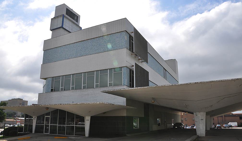 I’m pretty sure this was/is a Bank of the West (also in Omaha). Not quite sure how much “in use” this building is. But it had a sweet old bulb clock display (which I think was working), these neat mushroom columns, and blue and white tile. Sorry about the hexagonal crap in this photo — forced to shoot into the sun & other angles were worse.