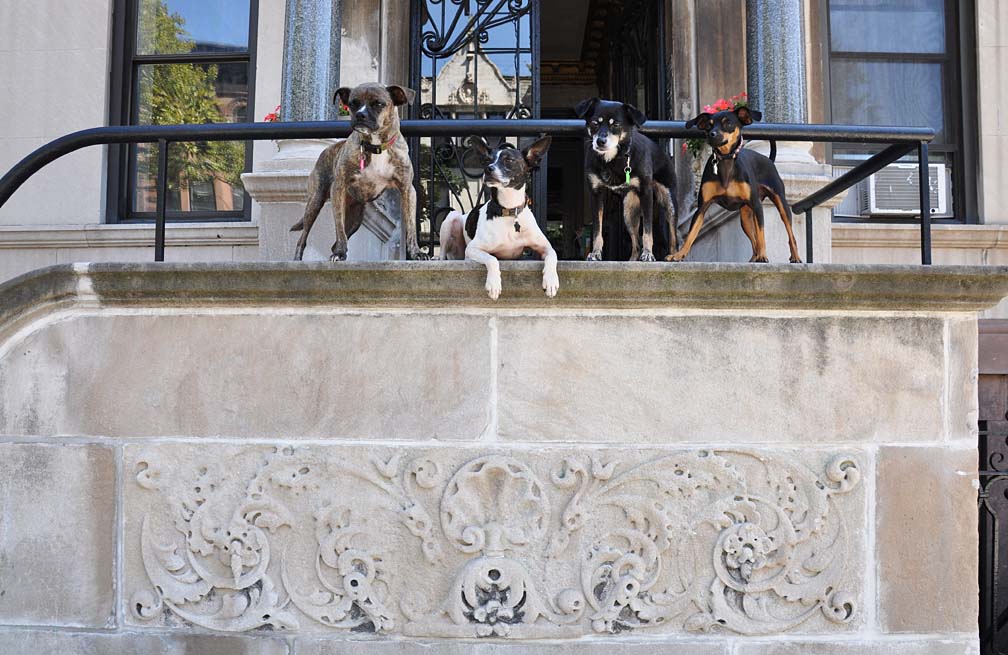 No food photos for you (although I could’ve gotten my NYC bagel I suppose) but I took a few of the dogs this morning for you to close with. For those of you that are not familiar with “stoops”, they are a big part of city life at least out here in the Northeast. Used kind of like a tiny porch — people hang out on the steps to talk, eat, have “stoop sales” (like garage sales). Anyhow, this one is one of my favorites with the leafy detail right across the street from my apt.