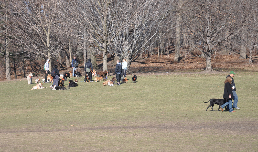 While many owners are off at their day jobs, they pay dogwalkers to bring the dogs to the park. Most of the dogs lounge on this hill in an enormous pack.