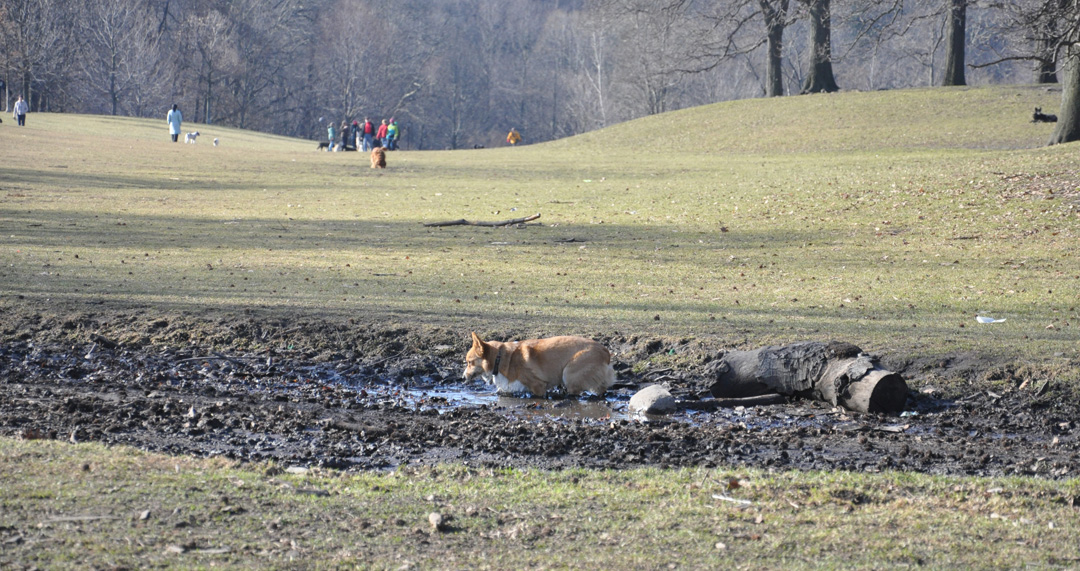 A Corgi enjoying a mudbath: