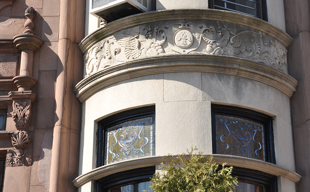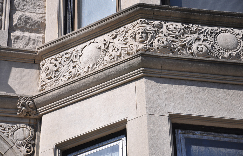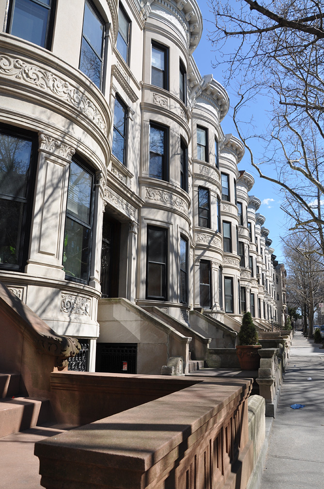 OK, shall we move on out of the park for some buildings on the short walk home? Park Slope, my ‘hood, is part of “Brownstone Brooklyn” which is usually defined as an area that runs from the park to Brooklyn Heights (the closest neighborhood to Manhattan). Most of the residential buildings in the landmarked areas are from the late 1800s. Not really my era – I prefer 1920s onward and especially 1950s-1970s – but I’d have to be heartless not to think these buildings were stunning. The craftsmanship and variety is incredible. Here’s a little strip of repetitively gorgeous limestones: