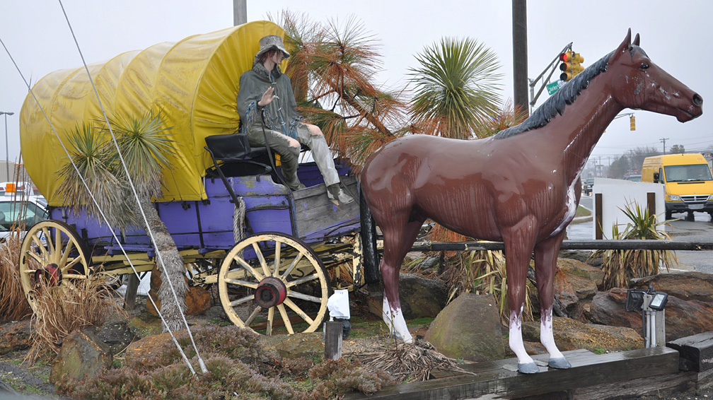 A rather eerie mannequin driving this covered wagon at Pistol Pete’s Saloon in Pleasantville: