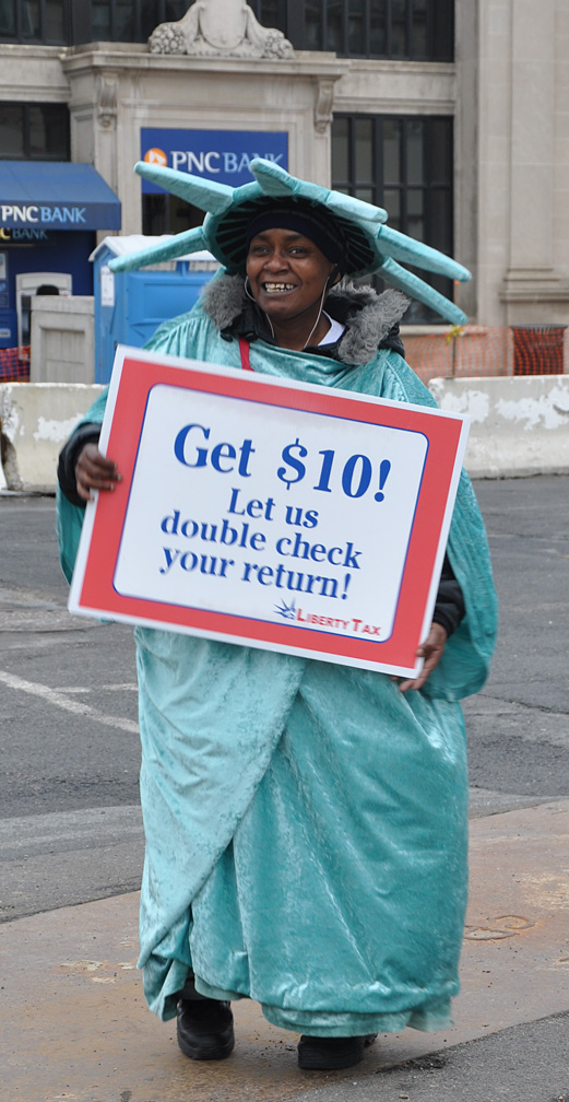 I have been taking these big March trips for awhile now and have many memories (and photos) of these dancing Liberty Tax people from various cities. It’s become a habit to shoot one per trip. This woman in DC was really getting down with her dancing before I stopped with camera. Then became all hiding and worried. Never quite got the moves back even after I explained the photo was “just for me”, a souvenir of my travels, etc. But at least she got back to smiling. Now, is there a Flickr group for dancing Liberty Tax people? There’s just gotta be.
