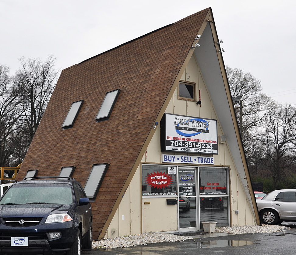 Just a bit further west – an A-frame used car lot office. I don’t know if that was the original use — but something tells me all those windows were added later: