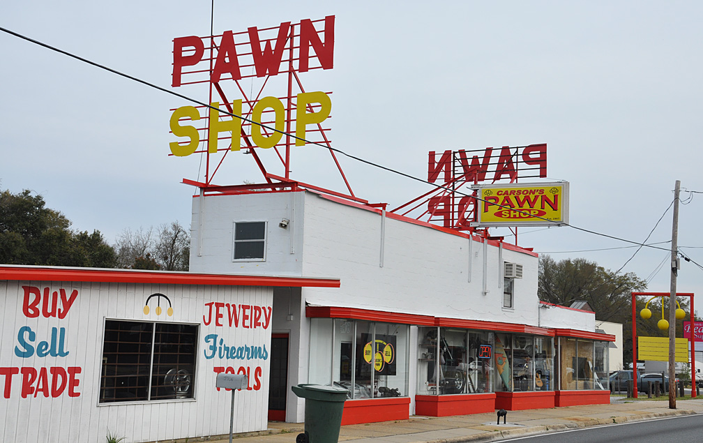 Quite cheerful for a pawn shop. Note the 3-ballie pawn shop symbol sign on the far right: