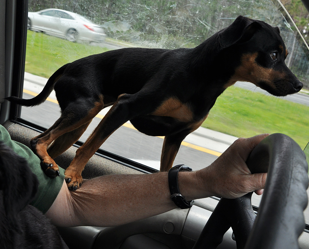 This is how Gremmie rides about 80% of the day. Drivers that notice to the left of me either smile or yell at me. She’s balancing left legs on the door shelf and right legs on my arm. She only weighs about 10 pounds so it doesn’t bother me that much. If she sees a motorcycle, dog or something bark-worthy, she immediately jumps in the back, over my shoulder and goes nuts. Been doing this for years now and it doesn’t distract me one bit.
