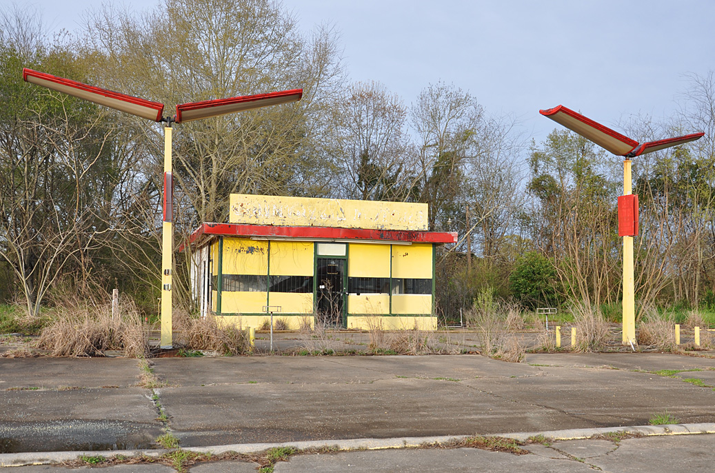 Finally, around 7pm in Dothan, AL, the sun came out. This dreary abandoned gas station was made cheery by the near-sunset reflecting on it: