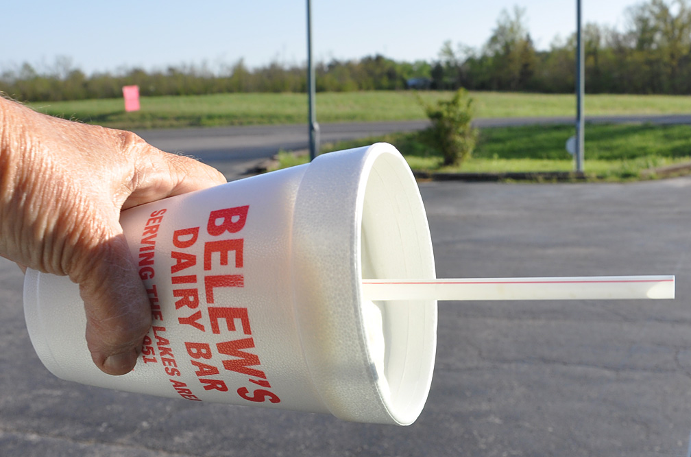 My westward route towards the end of the day took us over a very pretty stretch with lakes (including “Land Between the Lakes”). Had to stop for the dogs of course. Nearby, I stopped to shoot the neon sign at Belew’s Dairy Bar in Aurora. As I was doing so, the owner called me over for a free milkshake. They hadn’t opened for the season yet but he was there testing out the equipment. The shake was super thick and filling — that was dinner. The dogs loved it, too:
