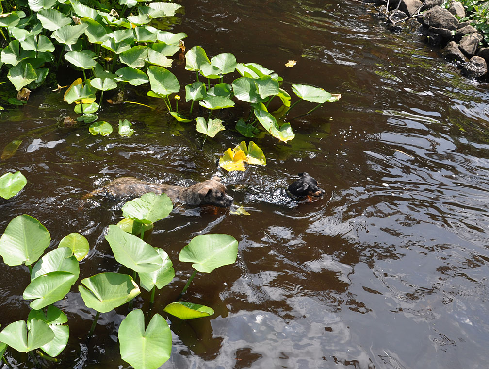 Fix & Grem enjoying my tossed treats. Today’s floating offering was bits of English Muffin. Grip – no WAY was she going in the water past her tippy toes even in the heat. She got caught in a teensy tiny river current a few years ago and decided that was that for swimming.