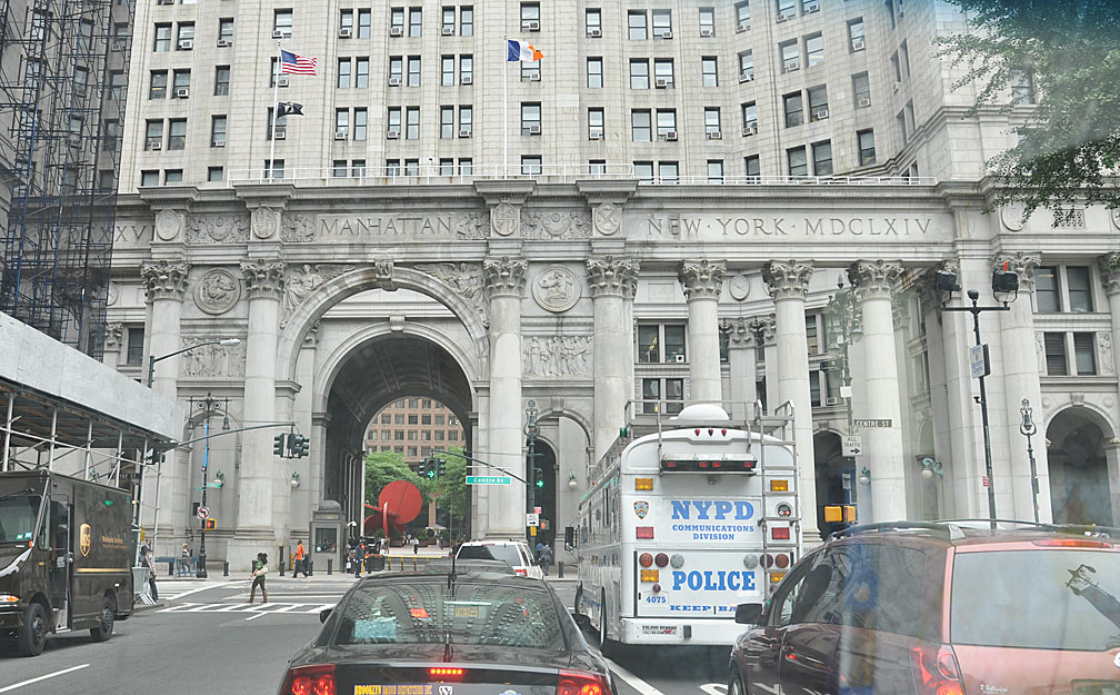 And then after a very, very long drive — back to my own and very different reality. My personal “coal mine” in NYC — a far more safe and comfortable living. But anything but glamorous or personally rewarding. This trip concluded with a trek through the Holland Tunnel into Manhattan. This photo is of the Municipal Building in Manhattan just before the turn onto the Brooklyn Bridge heading home. The dogs go on alert with all noses in the air back at some point in NJ just before crossing the river into NY. So by now they are all revved with the excitement of reclaiming their territory. Add much barking, panting, whining sound effects to this photo: