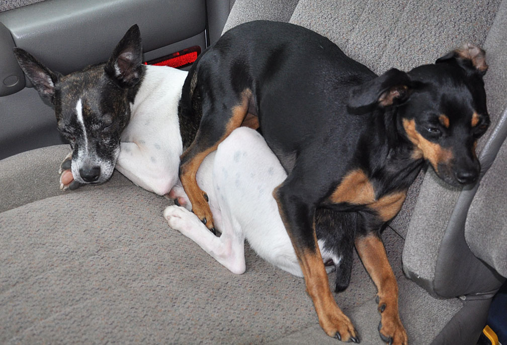 Lots of long stretches of driving today meant much dozing for the dogs. Grem parked on her favorite sofa (Nik) a good part of the day. He barely noticed.