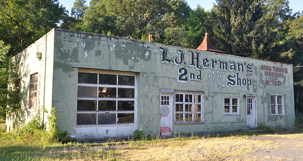 Let’s get to it. A few quick pitstops in NJ first en route to PA. Bumped into this place in East Windsor. This is apparently an adapted gas station. But I can’t explain the tower on the roof. Guess they just tried to make it charming? I love hand-painted signs — and this one gets extra credit for the painted hand. Seems to be long vacant now: