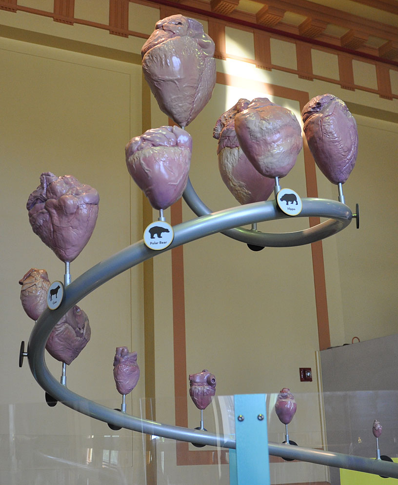 I finally sucked it up and forked out $13 bucks or so and parked the dogs in the shade to see the Giant Heart (see tonight’s Flickr stream) at the Franklin Institute. While there, I found some other interesting things to make the expense worthwhile. Here’s a revolving display of different animal hearts: