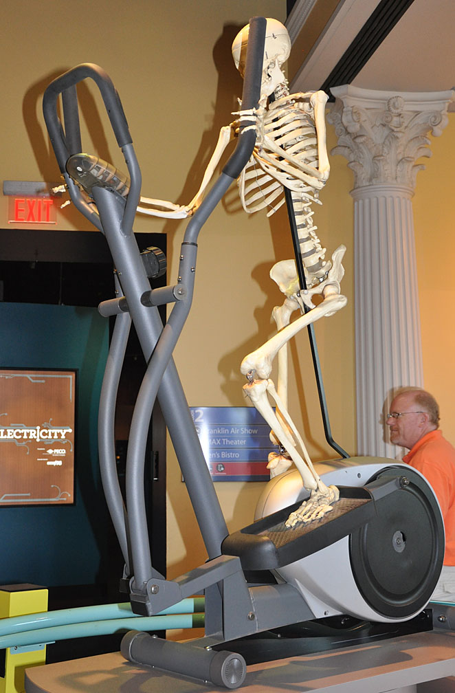 A skeleton on an elliptical treadmill. It was moving so you could see how the bones function: