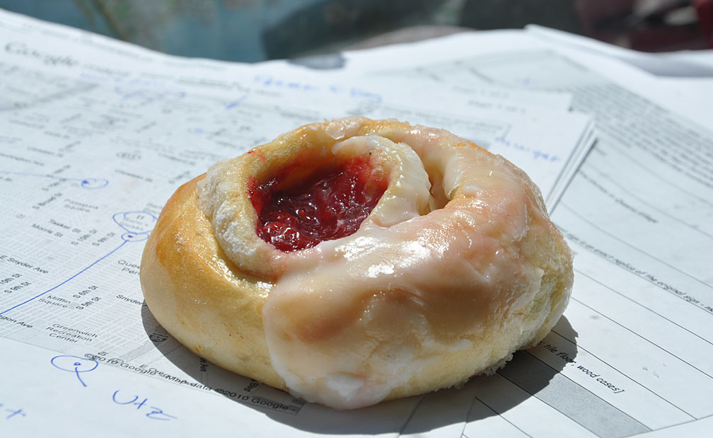 And, yes, I picked up some snacks for later — gotta show my support! Here’s a “cherry meltaway” — displayed in my classic pose now — on the dash with the maps & itinerary for the day. The scale might be hard to tell from this shot — think donut sized: