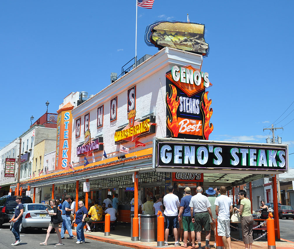 More on the food theme… I haven’t been by the Philly Cheesesteak Center of the World lately. I must say Geno’s has gone over the top on their signage — while Pat’s remains low-key and traditional. Lines were just as long at both places: