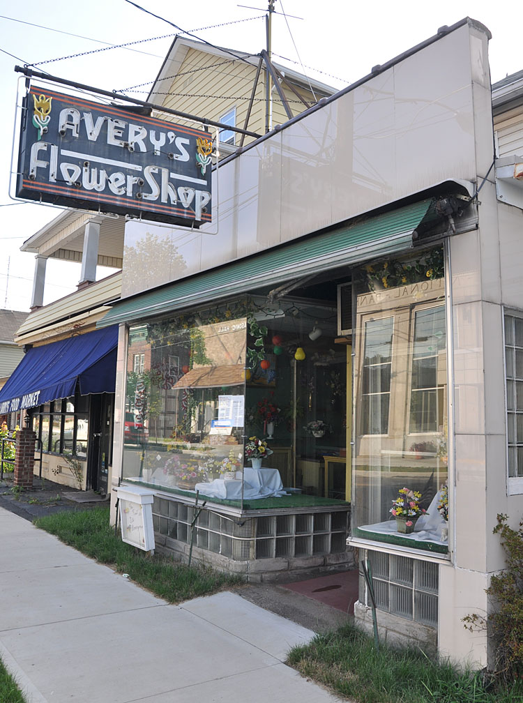 From Jermyn, PA — I put a close-up of the Avery’s Flowers sign over at Flickr. This is the storefront shot — yep — iced coffee colored vitrolite (glass tile) and apparently original glass block: