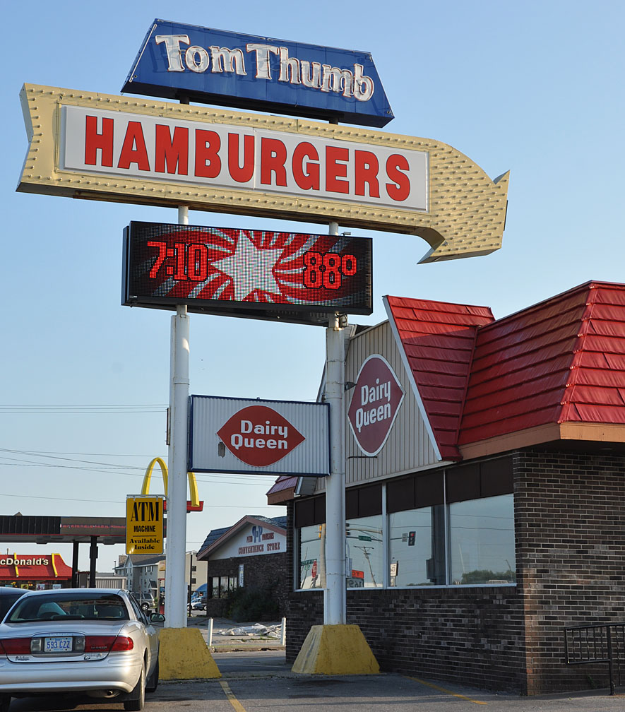 One more before I hit the highway (sun’s up and not a cloud anywhere in this big Iowa sky). From Fort Dodge — do you think Dairy Queen knows/cares about this Tom Thumb sign dominating one of their restaurants? The size and style of this sign make me wonder if there were other Tom Thumb locations. Nothing comes up from a quick poke at Google though.