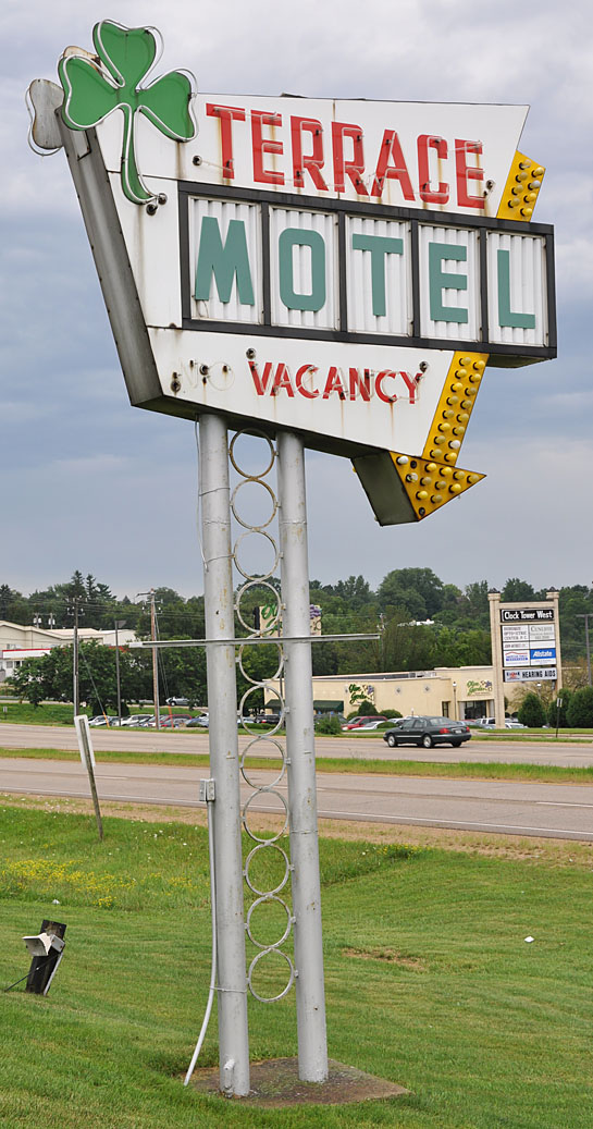 This is from East Dubuque, IL — just before (finally) crossing the Mississippi River. There are actually two identical scaffold signs like this on either side of this hill:
