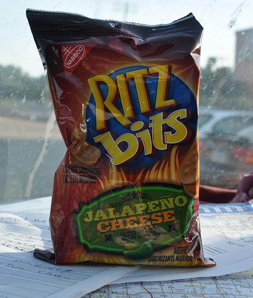 Dashboard treat time. Desperate for stamina boosters at a gas station c-store, I came across this new-to-me snack. Very spicy which helps when you’re fading at the wheel. Three of the dogs didn’t mind the intensity. But Fixie, who’s the only one that usually chews her snacks, gave me a “that was a dirty trick!” look. I give them a B- and wouldn’t buy again. Note this is a small bag — it just looks huge in this photo. And the little Ritz sandwiches are about the size of a quarter.