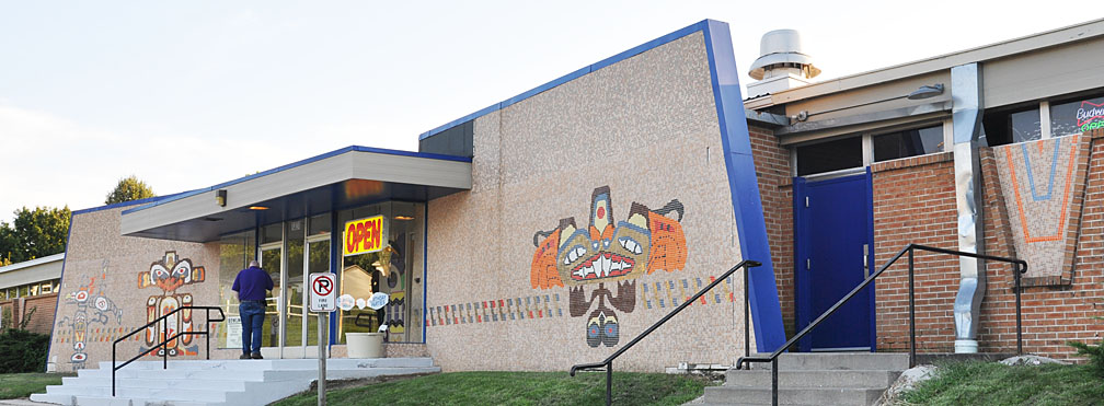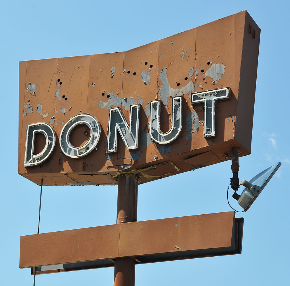 The former Mister Donut sign in Des Moines. Now Donut King but they let the sign live. Sort of. You can still make out the “Mister” at the top of the sign if you stare at it long enough.