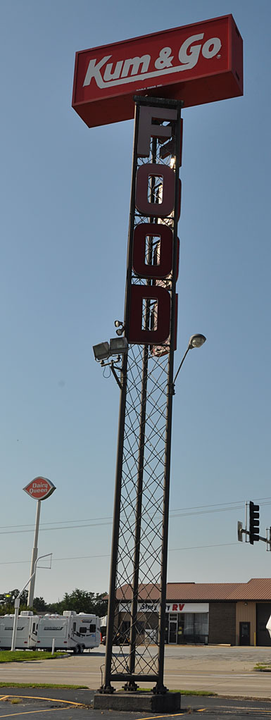 From Story City. Yes, these Kum & Go gas stations are all over the place in Iowa. There are also Git N Go. And Casey’s gas stations. I think I’ve been to 50 Casey’s in the last three days. I sure miss Sheetz and Wawa though — which are way huger and have much great snack selection (even healthy stuff). Anyhow, I don’t know what the original gas station brand was here, but evidently it was part of a chain. In the past couple days, I’ve seen remnants of these “Food” towers at other gas station combo restaurant locations. I’m assuming the food sign must’ve been neon and visible for 20 miles — and outer space: