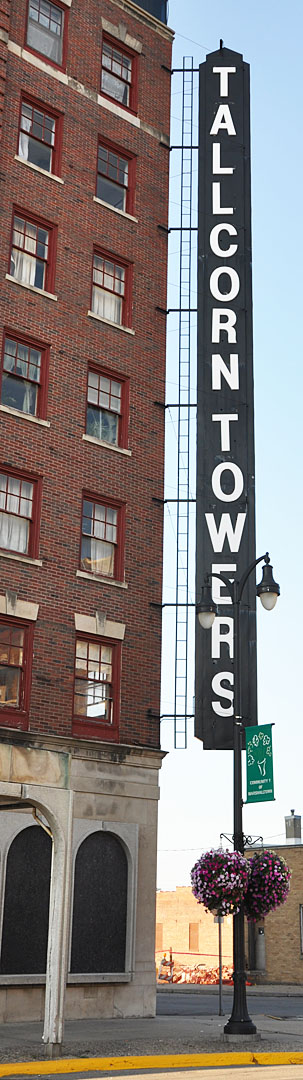 Here’s another candidate for the world’s tallest, or top 10 tallest, blade sign. Most likely a hotel-y name before it became the Tall Corn Towers (apartments). The neon now substituted with plastic letters. But still fun.